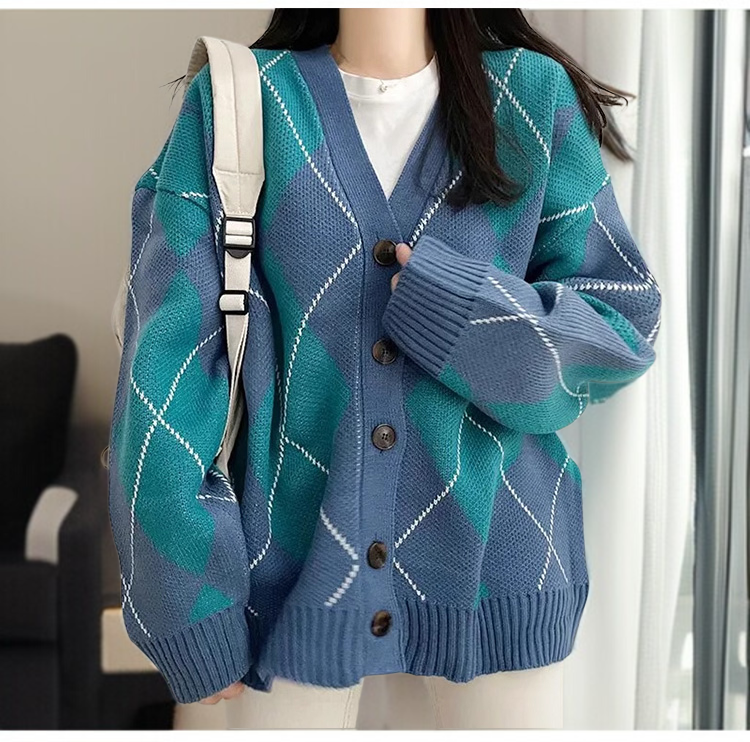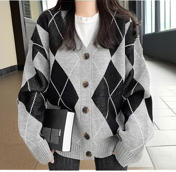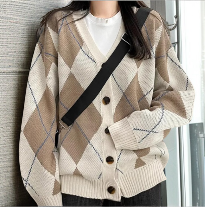 여성 아가일 당색 니트 카디건 아웃도어 학원풍 루즈핏 울 카디건 나른한 스웨터 카디건